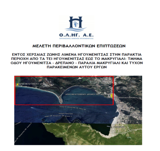Υποβλήθηκε από την ΟΛΗΓ Α.Ε., στις 30.8.2023, η Μελέτη Περιβαλλοντικών Επιπτώσεων Εντός ΧΖΛ Ηγουμενίτσας στην παράκτια περιοχή από τα Τ.Ε.Ι. Ηγουμενίτσας Έως Μακρυγιαλι : «Τμήμα Οδού Ηγουμενίτσας – Δρέπανο – Παραλία Μακρυγιαλι και τυχόν παρακείμενων αυτού έργων » ς και η Μελέτη Ειδικής Οικολογικής Αξιολόγησης της Ειδικής Ζώνης Διατήρησης (ΕΖΔ) 2120001 «Εκβολές (ΔΕΛΤΑ) Καλάμα» με αριθμό Περιβαλλοντικής Ταυτότητας (ΠΕΤ) : 2308995329 στο Ηλεκτρονικό Περιβαλλοντικό Μητρώο του Υπουργείου Περιβάλλοντος και Ενέργειας.Με την ανωτέρω υποβολή ολοκληρώθηκε η προβλεπόμενη εκ του νόμου (άρθρο 86 ν. 4504/2017 & άρθρο 53 παρ. 2 ν. 5039/2023) διαδικασία από πλευράς της Ο.Λ.ΗΓ.Α.Ε. για τη νομιμοποίηση και περιβαλλοντική αδειοδότηση τμημάτων επί ΧΖΛ Συβότων, Πλαταριάς, Σαγιάδας και Ηγουμενίτσας και προωθήθηκαν τα σχετικά αιτήματα έκδοσης των αντίστοιχων ΦΕΚ για τον επανακαθορισμό Αιγιαλού και Παραλίας των ανωτέρω τμημάτων από την Κτηματική Υπηρεσία Θεσπρωτίας.